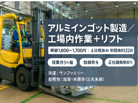 高時給1,600~1,700円+残業少なめ(月5h程度)でメリハリ勤務土日祝休み・年間休日122日で私生活も充実正社員登用制度あり(長期安定・定着率の高い職場)仕事内容は工場内作業+フォークリフト(資格保持者は優遇/未取得の方は入社後取得を応援)派遣先は株式会社三光米原(川島グループ)。アルミ合金・非鉄金属リサイクルを行う地域の中核企業です。
